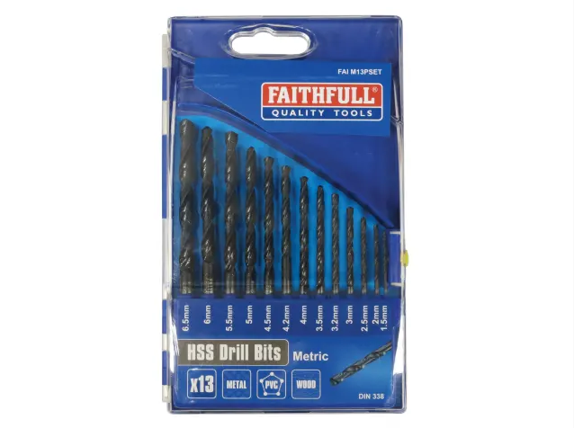 This Faithfull 13 Piece HSS Jobber Drill Bit Set contains commonly used sizes from the metric range.