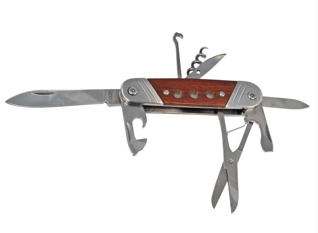 The Faithfull 8-in-1 Multi Blade Knife features a high-quality, 57mm stainless steel main blade. Additionally it features a 6mm flat driver / bottle opener, scissors, can opener, hook, corkscrew, awl and a small knife blade.