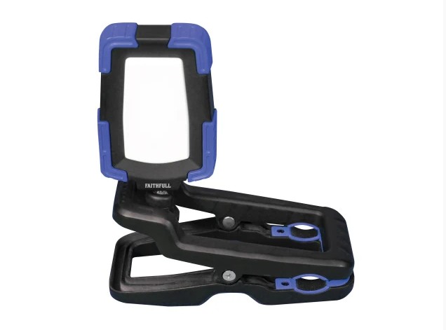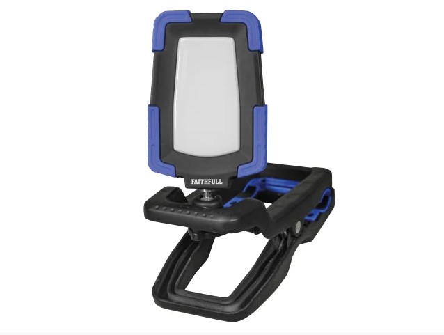 Faithfull Rechargeable Clip Light with a 10W LED that provides a high light output of 1000 lumens. Three output modes offer extended running times (100%, 50% and 25%). A 360° swivel ball joint allows the angle of the lamp to be adjusted to direct the light exactly where it is needed.