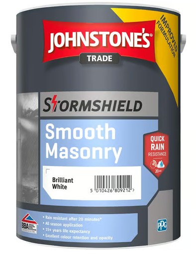 Johnstone’s Trade Stormshield Smooth Masonry paint is rain resistant after just 20 minutes and suitable for application between temperatures of 2°C and 35°C. This all-season exterior paint has excellent colour retention and opacity, outstanding anti-carbonation properties, and a life expectancy of more than 15 years. Stormshield Smooth Masonry paint is extremely durable and offers remarkable dirt resistance, whether it is being used on cement rendering, rough cast, brick, or concrete. Johnstone’s Trade Stormshield Smooth Masonry will cover up to 17 square metres per litre, depending on the nature and porosity of the surface being painted.